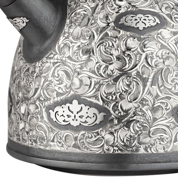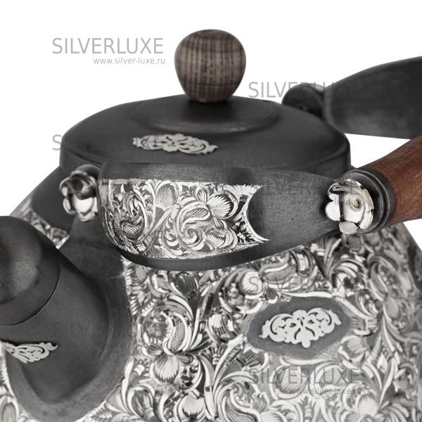 Серебро 875 пробы. Исполнение "Эконом" это работы молодых ювелиров. Чайник можно использовать на электроплите или на газовой плите с использовании рассеивателя. Гарантия высшего качества от фирменного магазина!