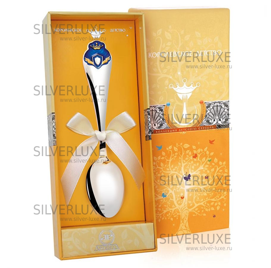 Серебро 925 пробы. С позолотой и эмалью. Фабрика серебра "Аргента". На ложечке изображен королевский герб, в котором можно сделать гравировку.