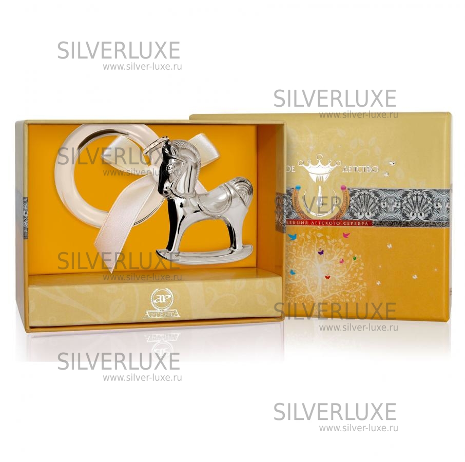 Серебро 925 пробы, акриловое кольцо. Фабрика серебра "Аргента". Изящная серебряная лошадка на акриловом кольце - занимательная игрушка для всех малышей. Её приятно рассматривать, её можно пробовать на вкус, она звонко звенит, её интересно трогать и одевать на ручку. В игре с такой погремушкой задействованы все органы чувств, что очень важно именно в раннем возрасте.