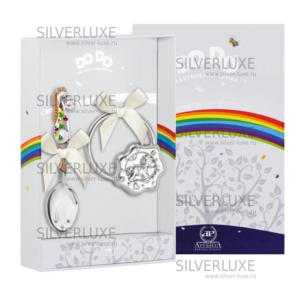 Серебро 925 пробы. Фабрика серебра "Аргента". Тактильная ложка "Лошадка в яблоках" с рыжей эмалью. Погремушка "Лошадка.
