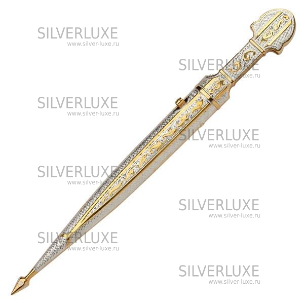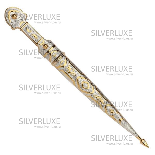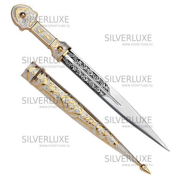 Серебро 875 пробы. Покрыт золотом 999 пробы. Клинок - кизлярская сталь. Средний вес серебра в изделии 100 гр. В премиумном исполнении от кубачинских ювелиров!