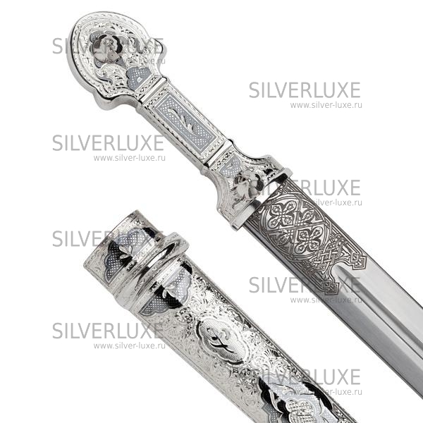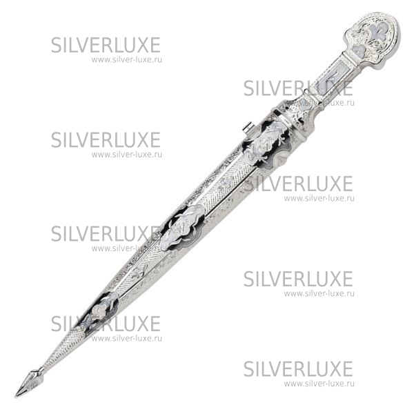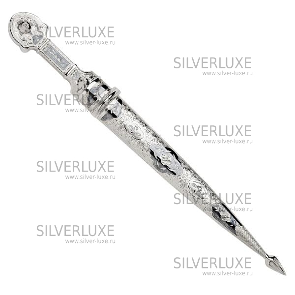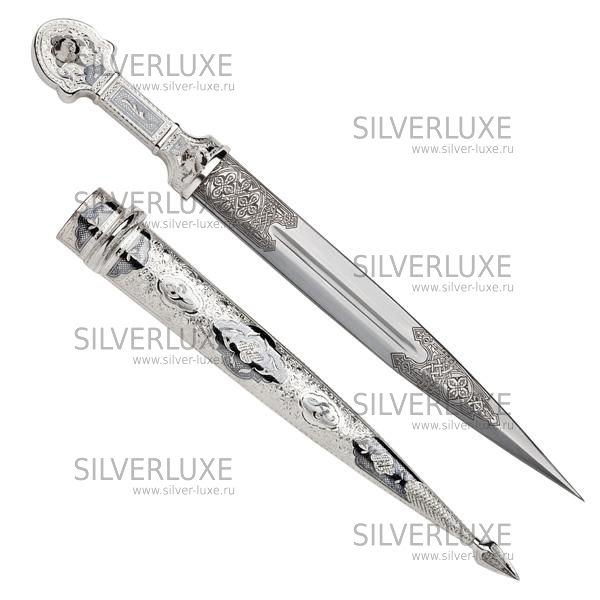 Серебро 875 пробы. Покрыт золотом 999 пробы. Клинок - дамасская сталь! Средний вес серебра в изделии 300 гр. По дренейшим традициям от кубачинских ювелиров!