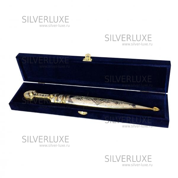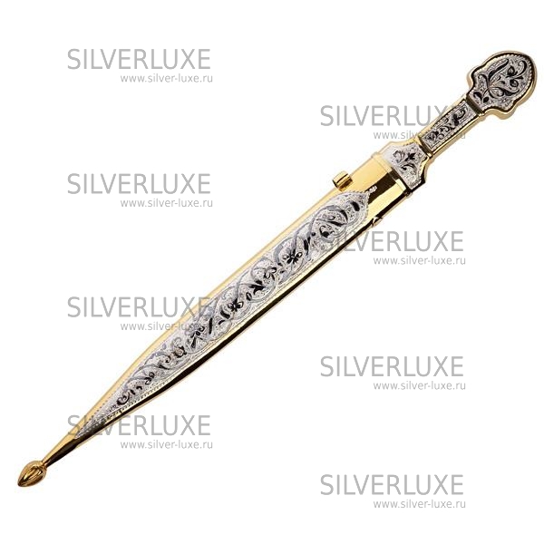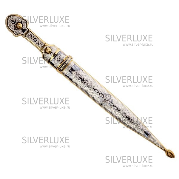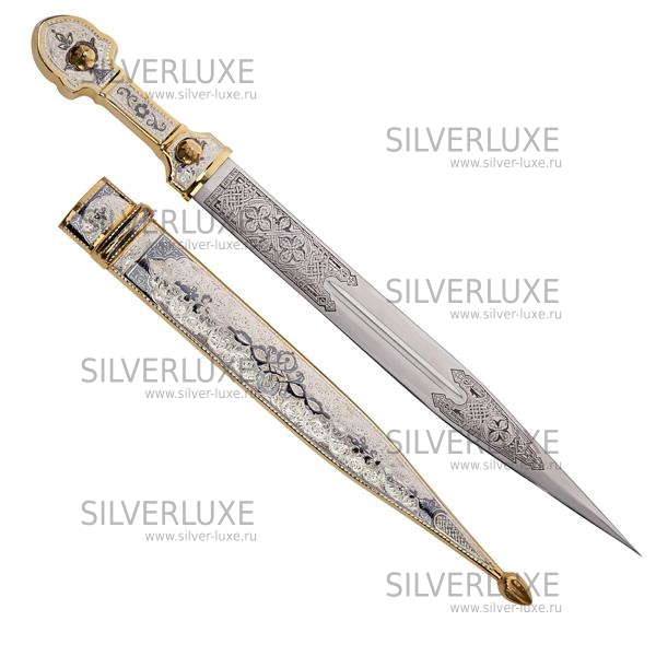 Серебро 875 пробы. Средний вес серебра в изделии 100 гр. Покрыт золотом 999 пробы. Клинок - кизлярская сталь.