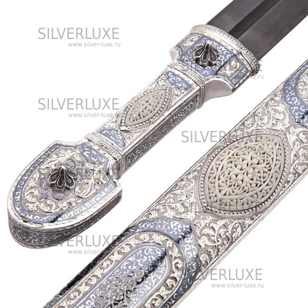 Серебро 875 пробы. Средний вес серебра в изделии 300 гр. Клинок - дамасская сталь! В премиумном исполнении от кубачинских мастеров! Вставка - слоновая кость.