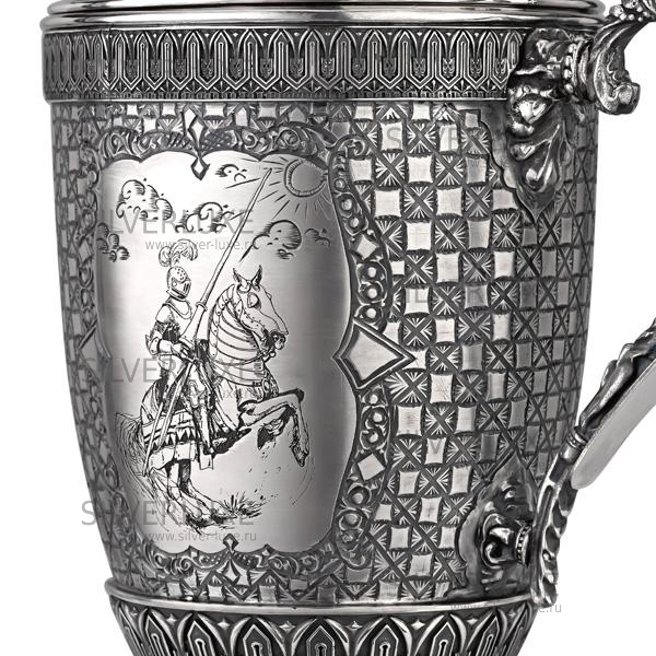 Серебро 925 пробы. На кружке изображены: замок, всадник на коне и воин. На оборотной стороне ручки, имеется небольшая площадка под гравировку. Гарантия высшего качества от фирменного магазина!