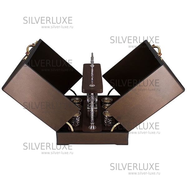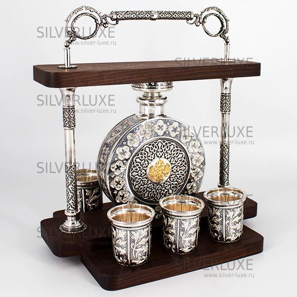 Серебро 875 пробы. В набор входят фляга и шесть стопок. Корпус выполнен из дерева с серебряным креплением. История кубачинского искусства насчитывает несколько веков! Принципы обработки серебра веками держатся в секрете и передаются от отца к сыну. Гарантия высшего качества от фирменного магазина!