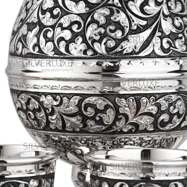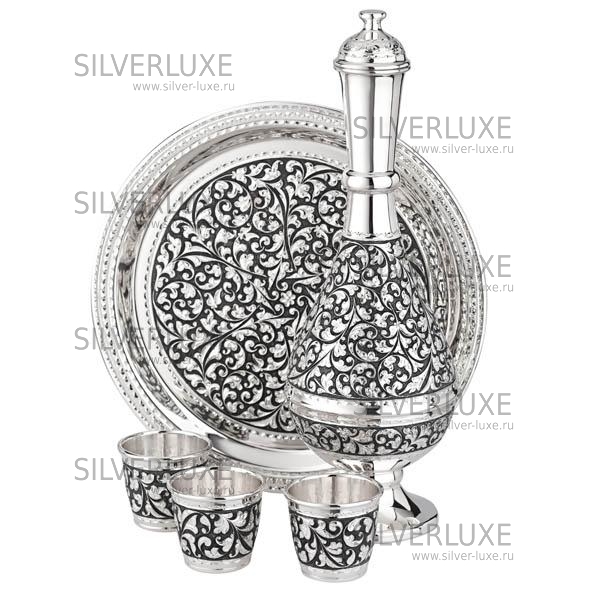 Сервиз из серебра 875 пробы, Для коньяка , водки, ликера .В сервиз входят: графин, поднос и три стопки. Великолепный серебряный сервиз от кубачинских ювелиров! Гарантия высшего качества от фирменного магазина!