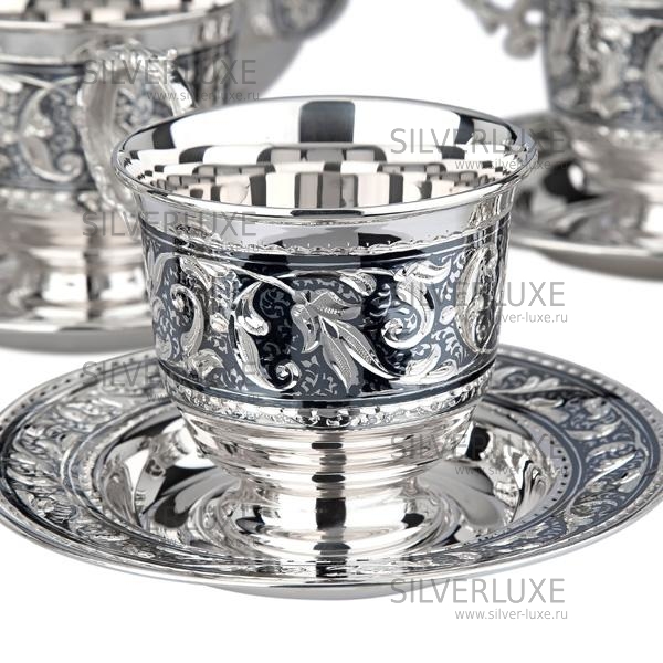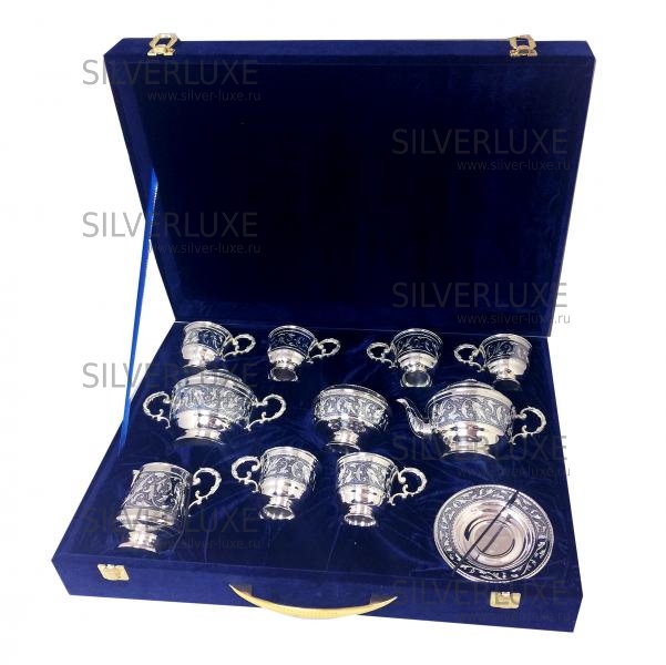 Серебро 875 пробы. В сервиз входит : чашки с блюдцем 6 пар, чайник, сахарница , конфетница, молочник.