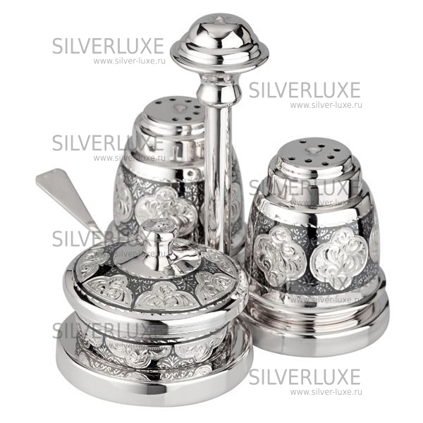 Серебро 875 пробы. В набор входят сольница, перечница, соусница и лопаточка. Прекрасное дополнение к любому столу! Серебряный набор для специй от кубачинских ювелиров. Гарантия высшего качества от фирменного магазина!
