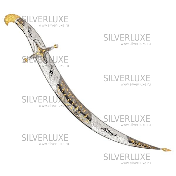 Серебряная 875 пробы, с позолотой 999 пробы. Рисунок - фантазия ювелира, традиционно в кубачинском стиле, но постоянно новый. Клинок - калёная сталь! Средний вес серебра в изделии 200 гр.