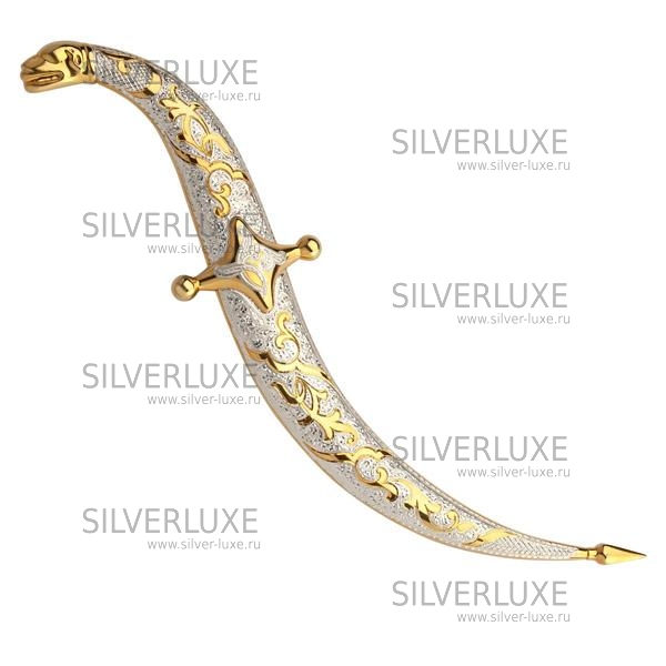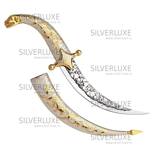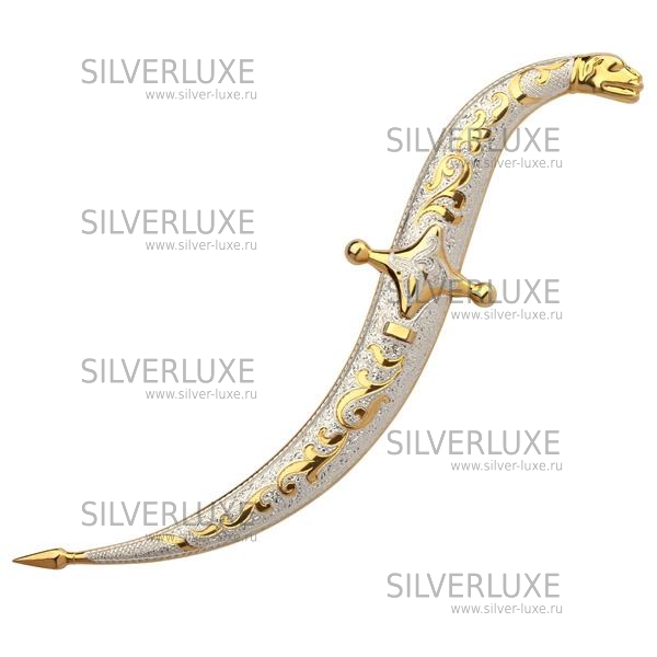 Серебро 875 пробы, покрыт золотом 999 пробы. Средний вес серебра в изделии 80 гр. Клинок - кизлярская сталь. Гарантия высшего качества от фирменного магазина!