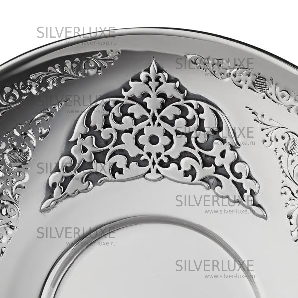 Серебро 875 пробы. Блюдце выполнено в стиле "Ретро", поверхность искусственно состарена. Местами поверхность нарочито заполирована, для создания оригинального состаренного вида. Ручная работа от мастеров Кубачи! Гарантия высшего качества от фирменного магазина!
