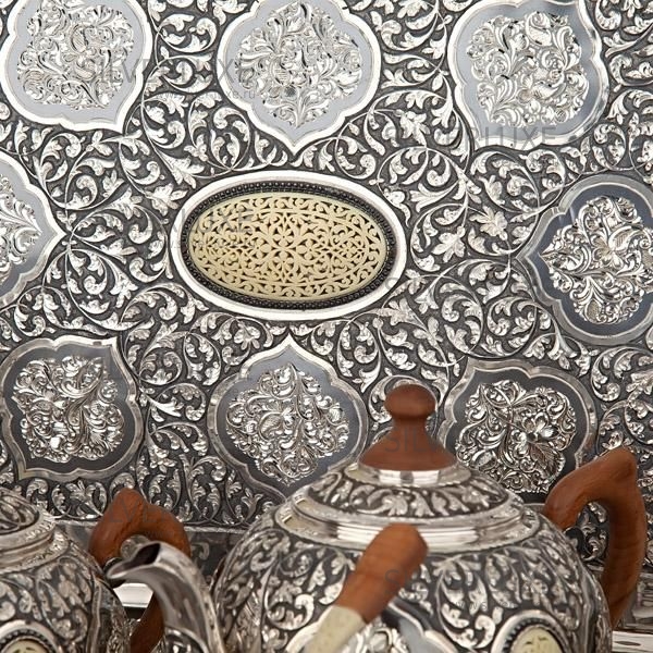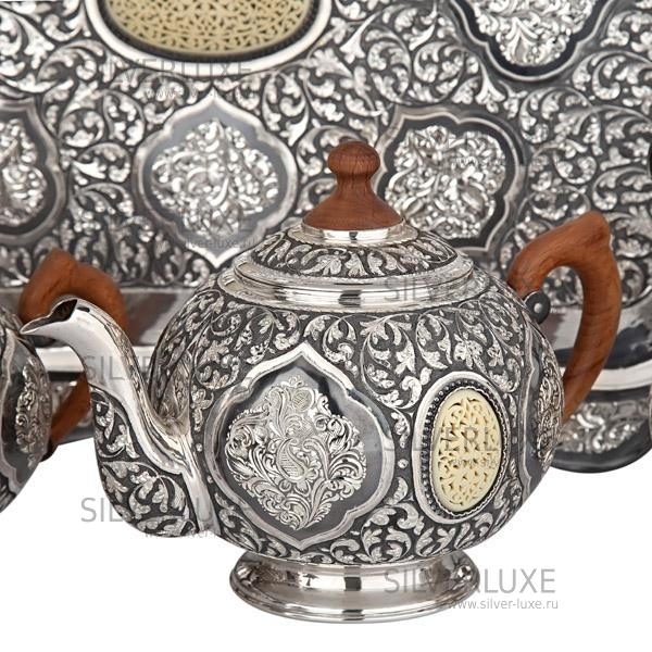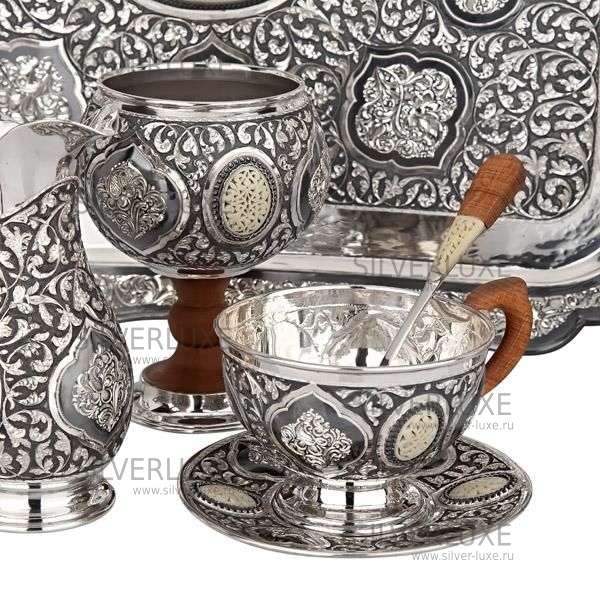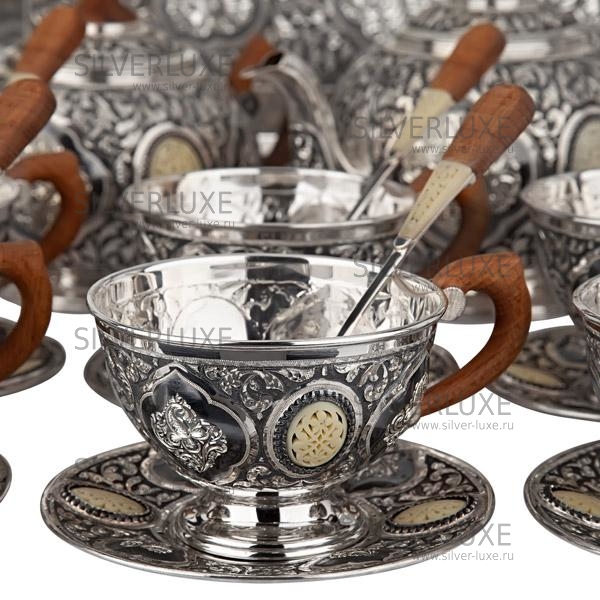 Серебро 875 пробы. Вставки- кость моржа, дерево кавказский дуб. В сервиз входят: чайник, сахарница, поднос, вареньица, конфетница, молочник, 6 пар чашек с блюдцем, чайные ложки 6 штук, щипцы. Роскошный набор от кубачинских ювелиров! Гарантия высшего качества от фирменного магазина!!