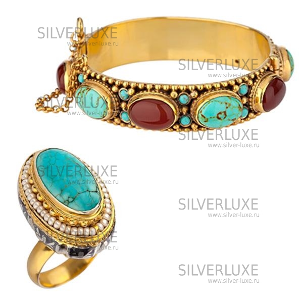 Серебро 875 пробы. С позолотой 999 пробы. Вставка - камень бирюза, сердолик, жемчуг. Изделие в подарочной упаковке.