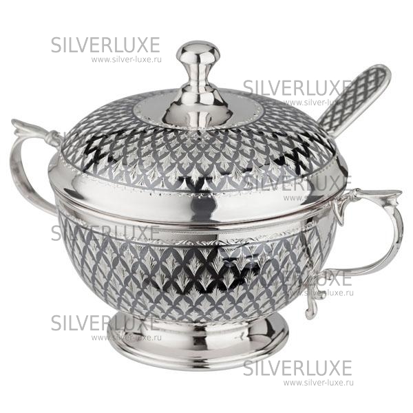 Серебро 875 пробы. В набор входят: сахарница объемом 300 мл и ложка.