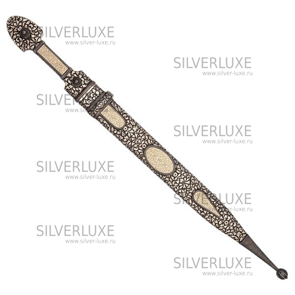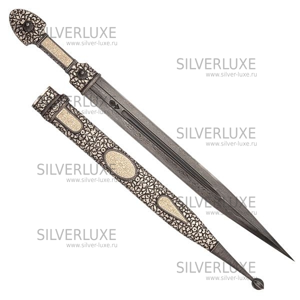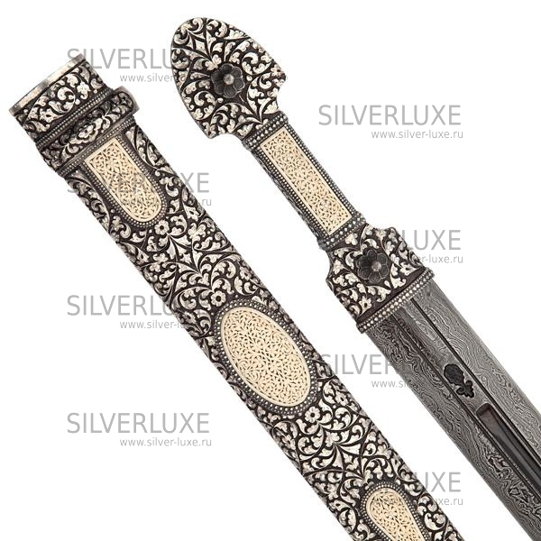Серебро 875 пробы. Средний вес серебра в изделии 300 гр. Клинок - дамасская сталь! Вставка слоновая кость. Гарантия высшего качества от фирменного магазина!