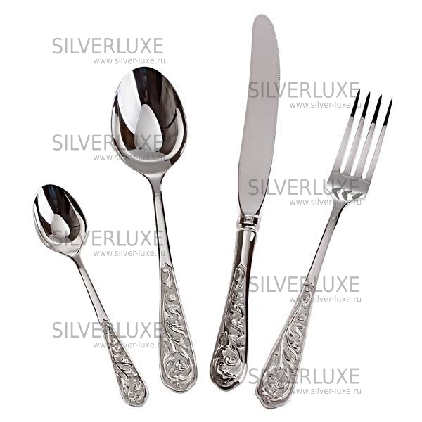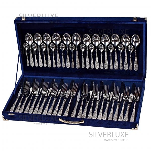 Серебро 925 пробы. Фирменный столовый набор компании "Кубачинское серебро" на 12 персон . В набор входят: ложки столовые 12 шт, ложки чайные 12 шт, вилки столовые 12 шт, ножи столовые 12 шт.