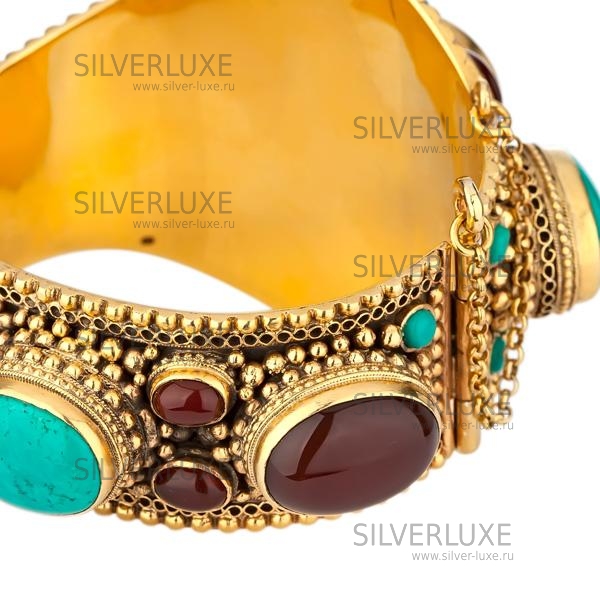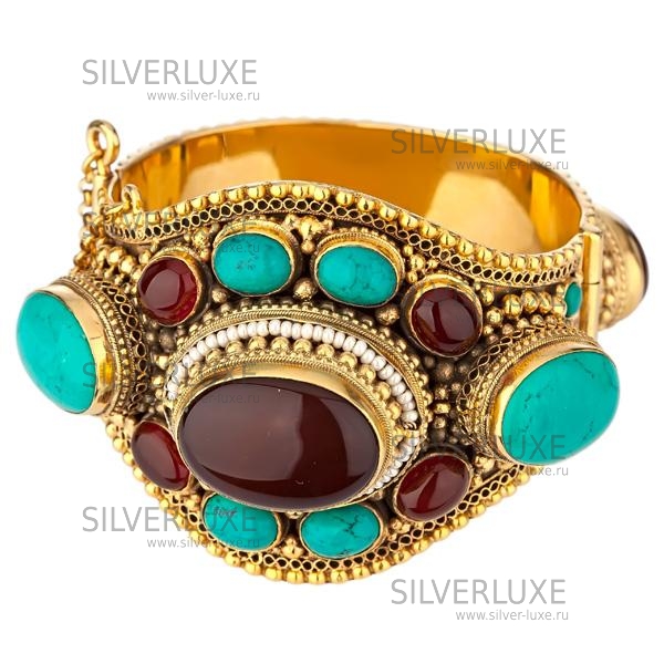 Серебро 875 (925) пробы, с позолотой 999 пробы. Вставка - камень бирюза, сердолик. Изделие в фирменной подарочной упаковке.