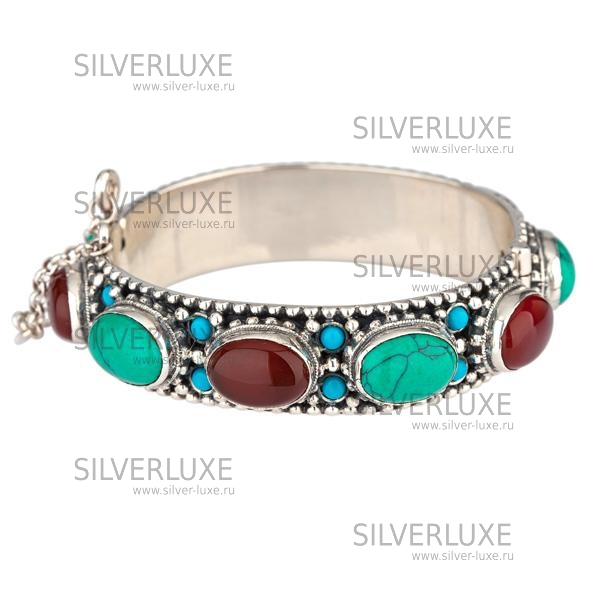 Серебро 875 пробы. Вставка - камень бирюза, сердолик. Изделие в фирменной подарочной упаковке.