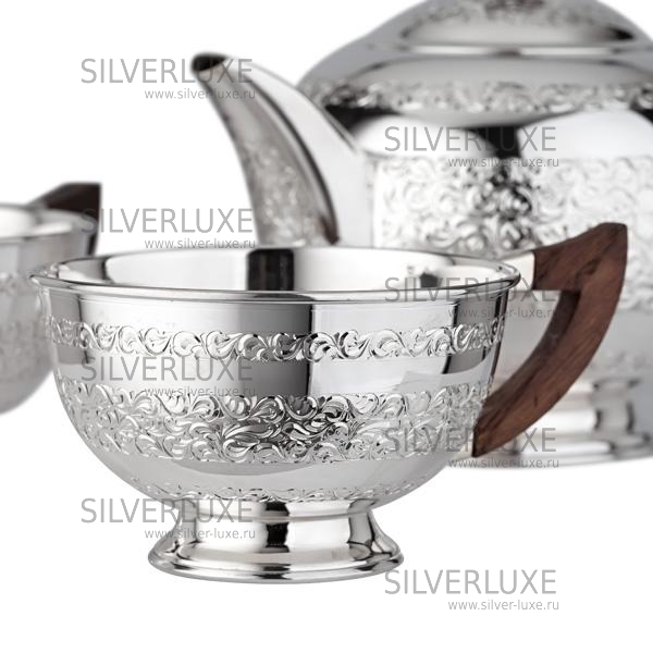 Серебро 875 пробы. В набор входят: чайник и две чашки. Вставки - дерево дуб.