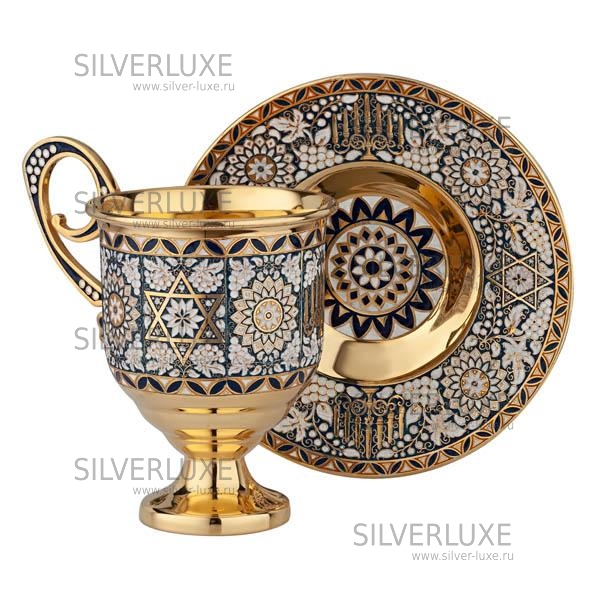 Серебро 925 пробы, с позолотой 999 пробы. С холодной эмалью. На изделии представлена звезда Давида и семисвечник менора.