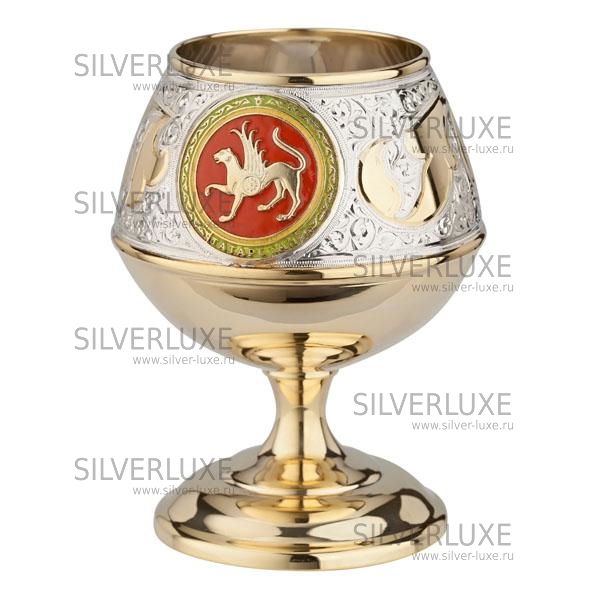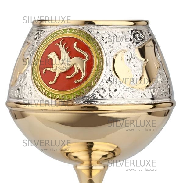 Серебро 875 пробы. Покрыт позолотой 999 пробы. На бокале изображен герб Республики Татарстан. Выполнено вручную кубачинскими мастерами!