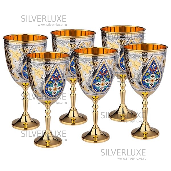 Серебряный 875 пробы. Набор бокалов на 6 персон , с позолотой 999 пробы и горячей эмалью.!