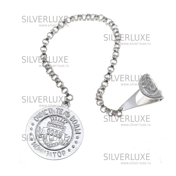 Ионизатор и крепление 999 пробы, цепь из серебра 960 пробы. Ионизатор воды из чистого серебра прекрасно очищает, облагораживает воду. Изделие в фирменной подарочной упаковке.