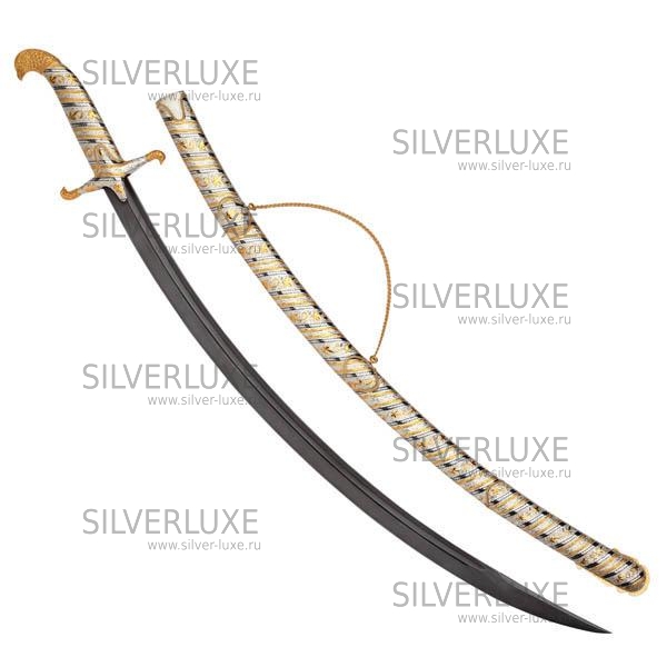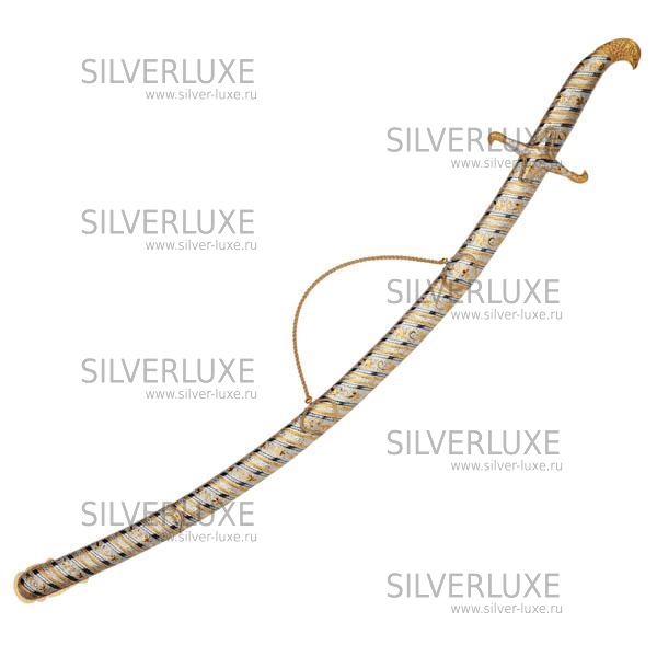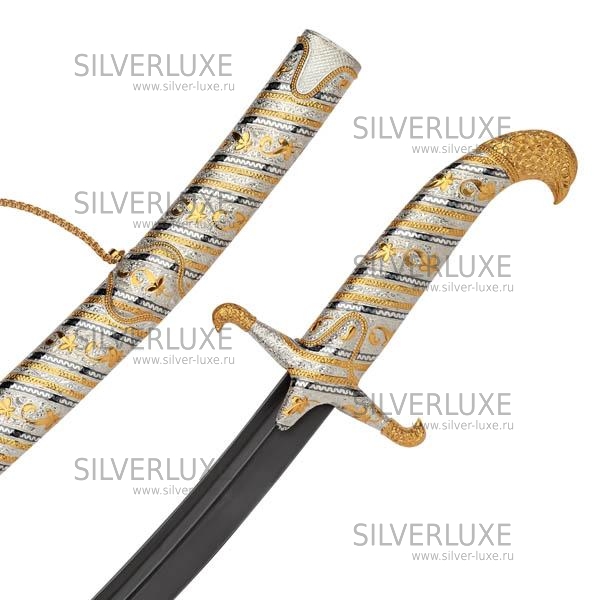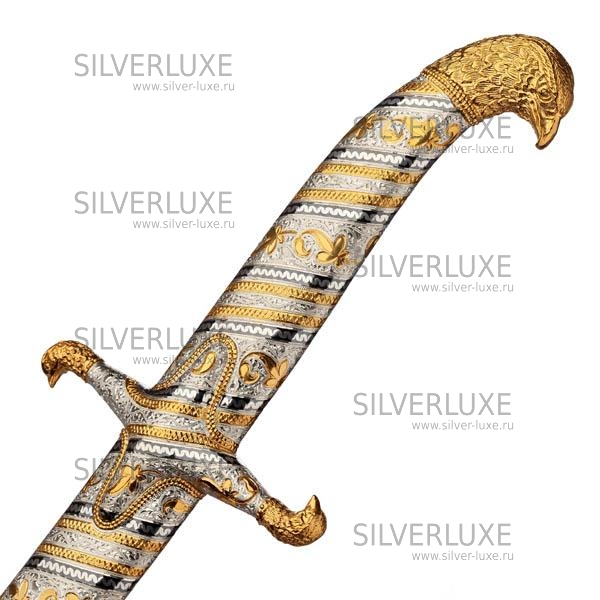 Серебро 875 пробы. Покрыт золотом 999 пробы. Клинок - калёная сталь! Боевая булатная сталь. Средний вес серебра в изделии 400 гр. Сабля, выполненная великим кубачинским мастером! Гарантия высшего качества от фирменного магазина!