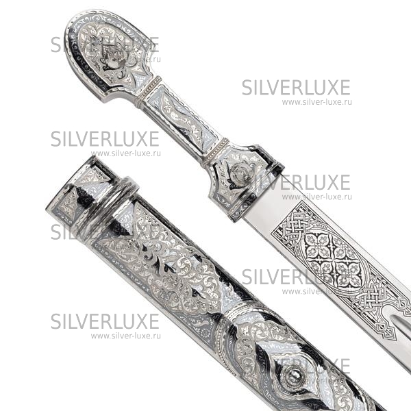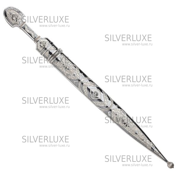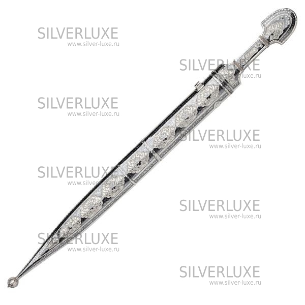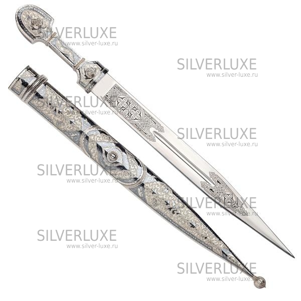 Серебро 875 пробы. Средний вес серебра в изделии 300 гр. В наличии имеется кинжал с каленной сталью. Изготовлен полностью вручную кубачинскими ювелирами! По дрейневшим традициям в премиумном исполнении!
