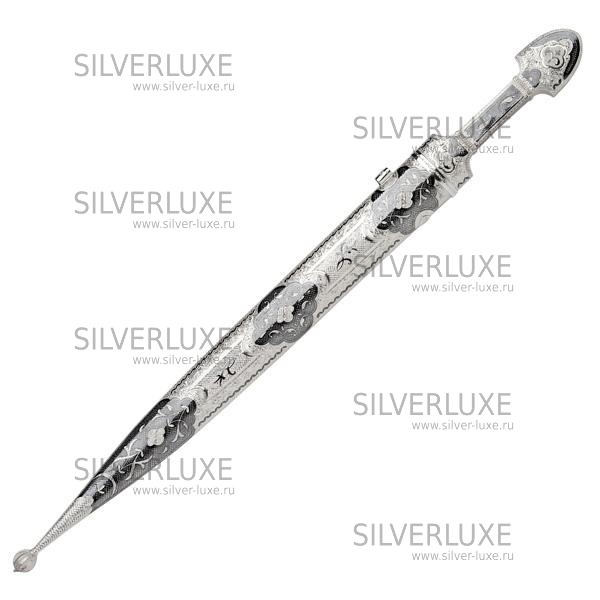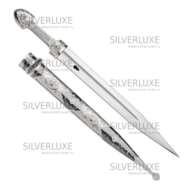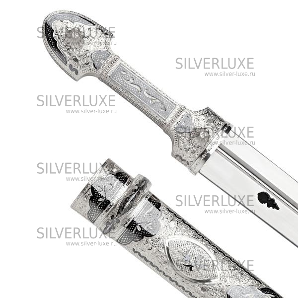 Серебро 875 пробы. Покрыт золотом 999 пробы. Клинок - дамасская сталь! Средний вес серебра в изделии 250 гр. Гарантия высшего качества от фирменного магазина!