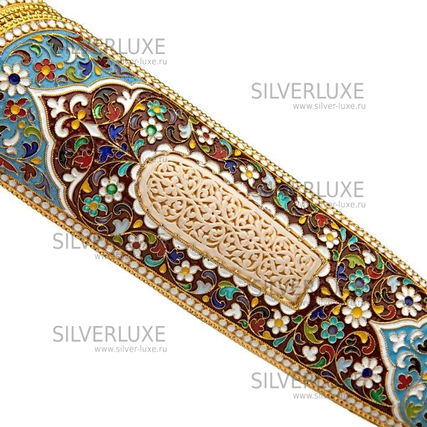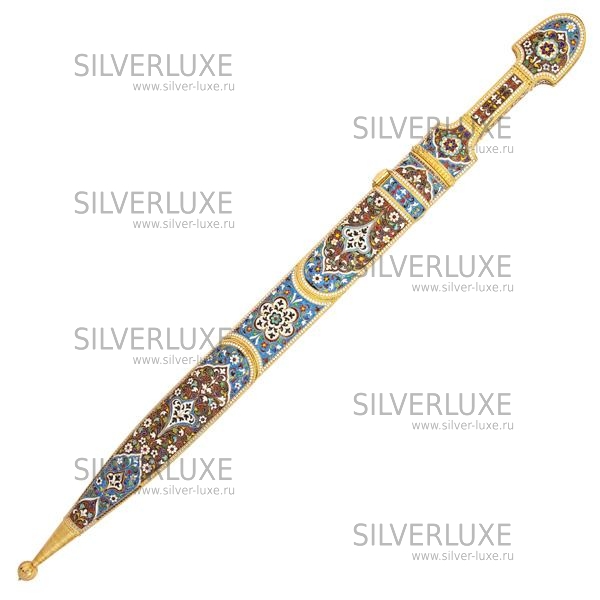 Серебро 875 пробы. Средний вес серебра в изделии 300 гр. Покрыт золотом 999 пробы. Клинок - каленая сталь! Вставки- горячая эмаль, слоновая кость! Ручная работа от кубачинских ювелиров!.