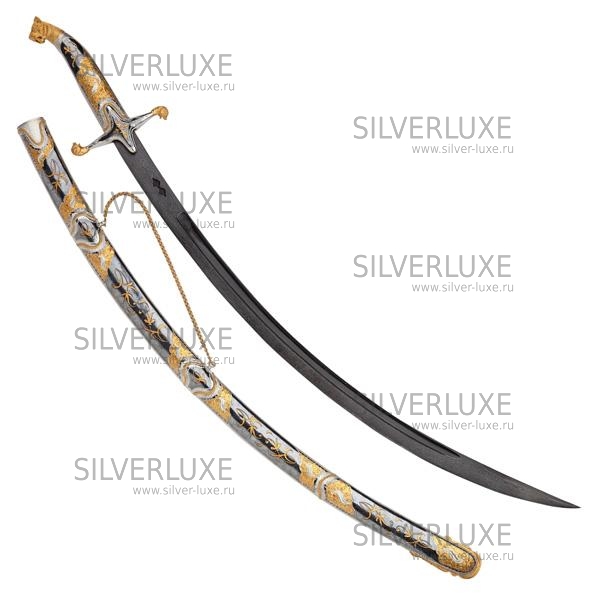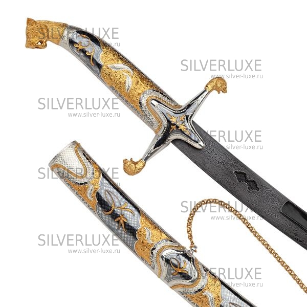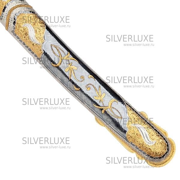 Серебро 875 пробы, покрыт золотом 999 пробы. Клинок - кизлярская сталь. Средний вес серебра в изделии 120 гр. В эксклюзивном исполнении от Кубачинских ювелиров!