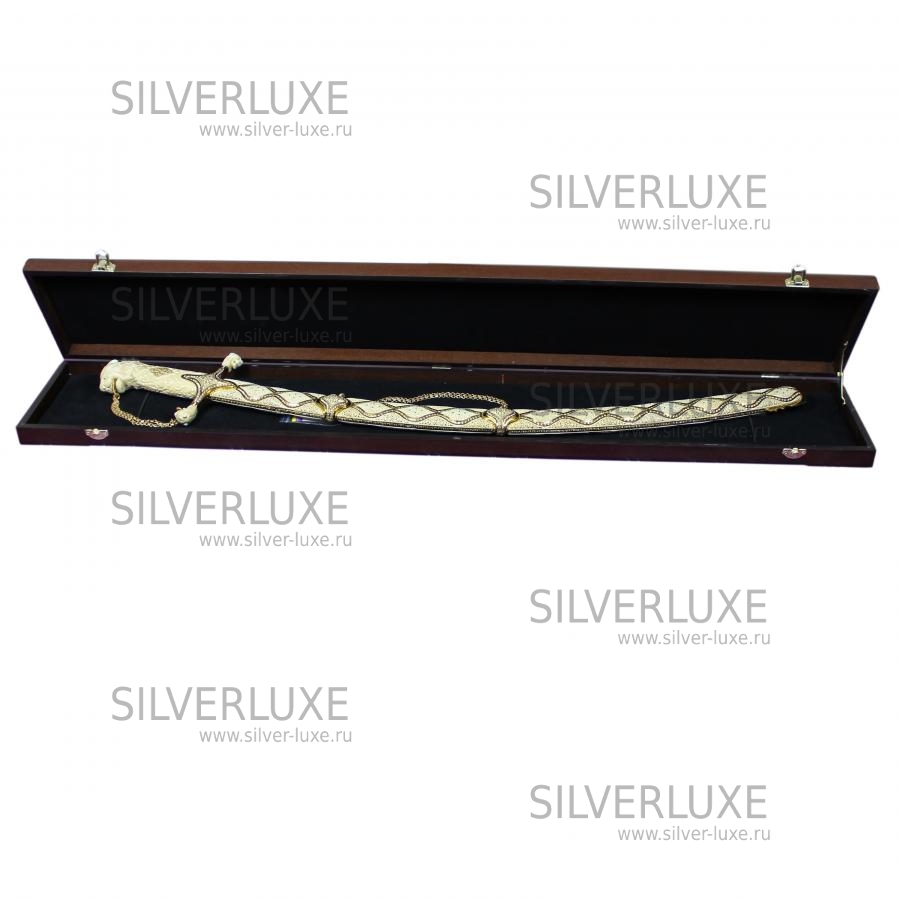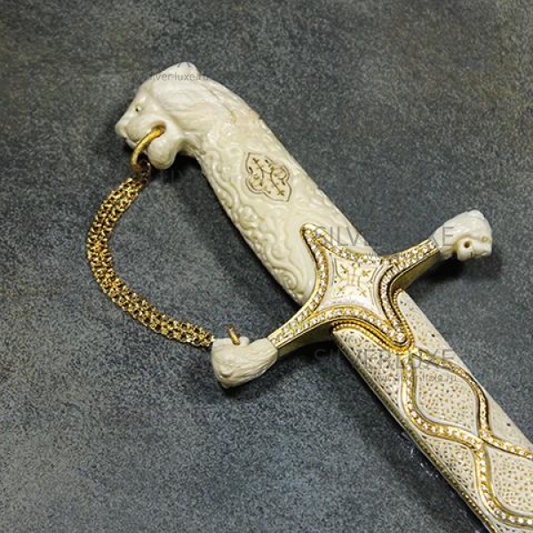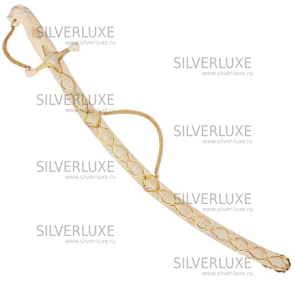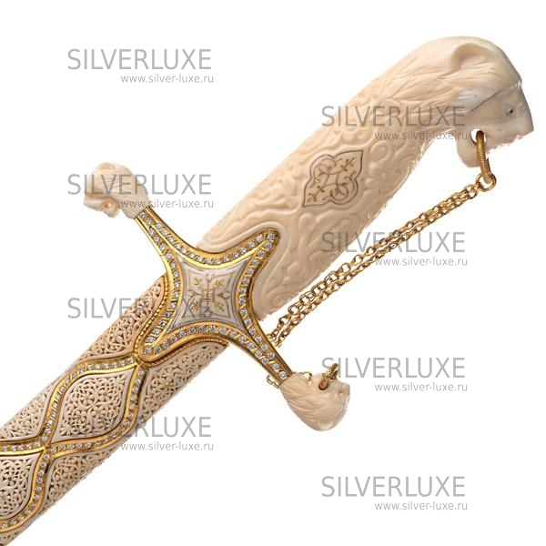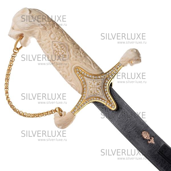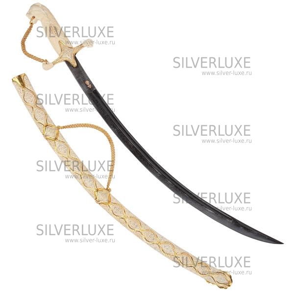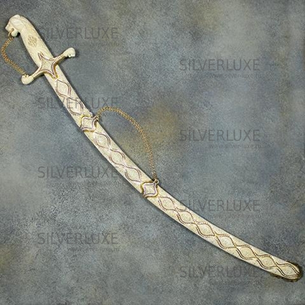 Серебро 875 пробы, с позолотой 999 пробы. Дамасская сталь. В сабле двойное лезвие с золотой насечкой. Вставки: слоновая кость и кристаллы сваровски. Выполнено по древнейшим традициям от кубачинских ювелиров! Гарантия высшего качества от фирменного магазина!