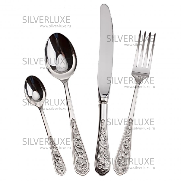 Серебро 925 пробы. Фирменный столовый набор компании "Кубачинское серебро", без чернения. В набор входят: ложки столовые 6 шт, ложки чайные 6 шт,вилки столовые 6 шт , ножи столовые 6 шт. Клинок ножа - нержавеющая сталь. Роскошный деревянный футляр из ясеня!