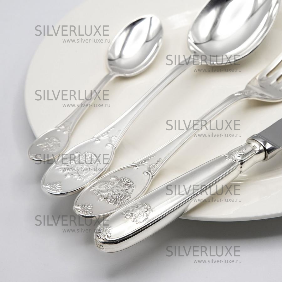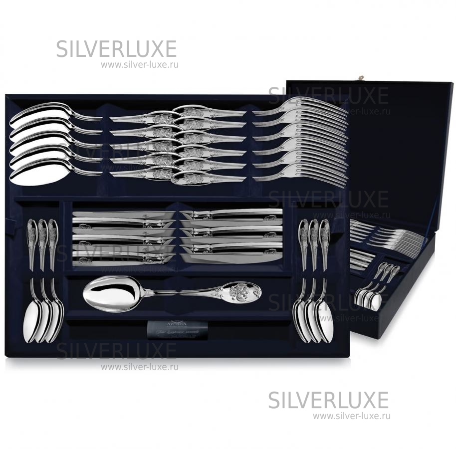 Серебро 925 пробы. Фабрика серебра "Аргента". В набор входят: ложки столовые 6 шт, ложки чайные 6 шт, вилки столовые 6 шт, ножи столовые 6 шт.