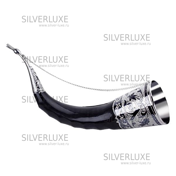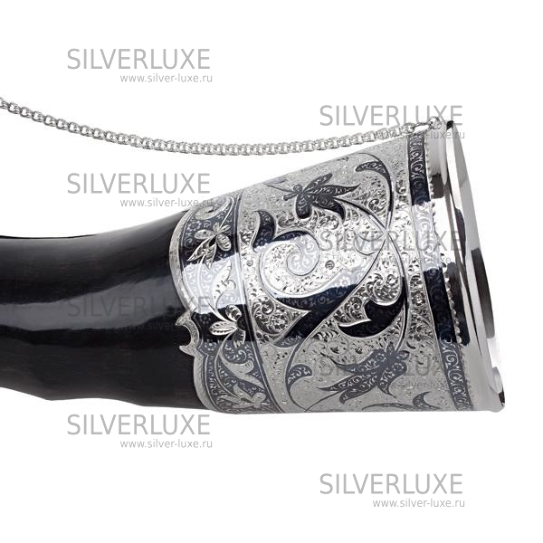 Рог быка, инкрустирован кубачинскими ювелирами - серебром 875 пробы в специальном эксклюзивном исполнении. С питьевой чашей!