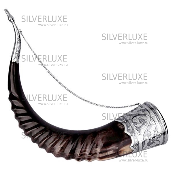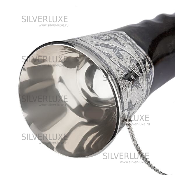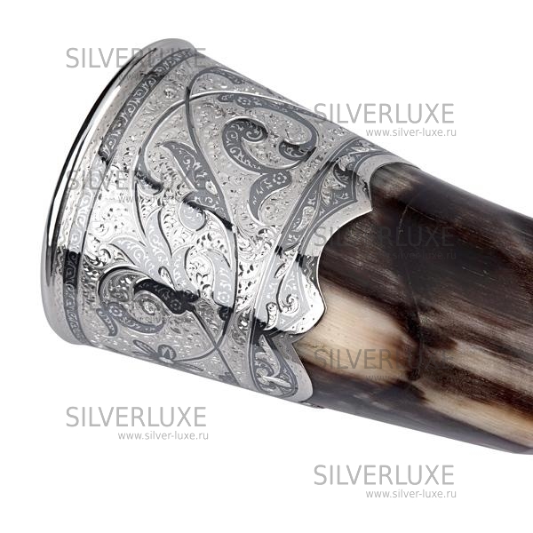 Рог тура инкрустирован кубачинскими ювелирами серебром 875 пробы . В эксклюзивном исполнении, с питьевой чашей.