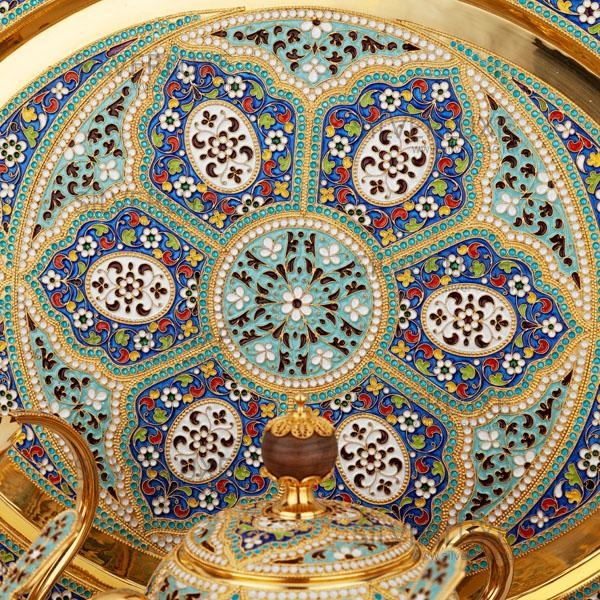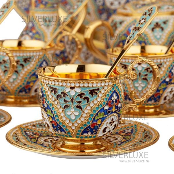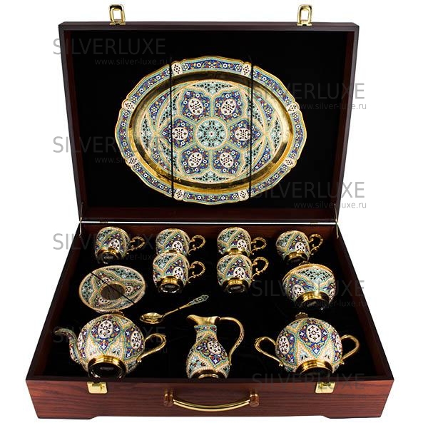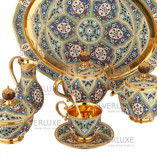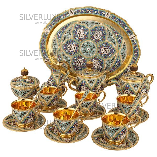 Серебро 875 пробы. Покрыт позолотой 999 пробы. В сервиз входят: поднос, чайник, сахарница, конфетница, молочник, чашки с блюдцем 6 пар, чайные ложки 6 шт. Круговая горячая эмаль - одно из самых сложных исполнений ручной работы. На чашках литые ручки. Деревянные вставки на крышках из горного дуба. Роскошный сервиз станет прекрасным украшением любого стола и интерьера! Авторская работа кубачинских мастеров!