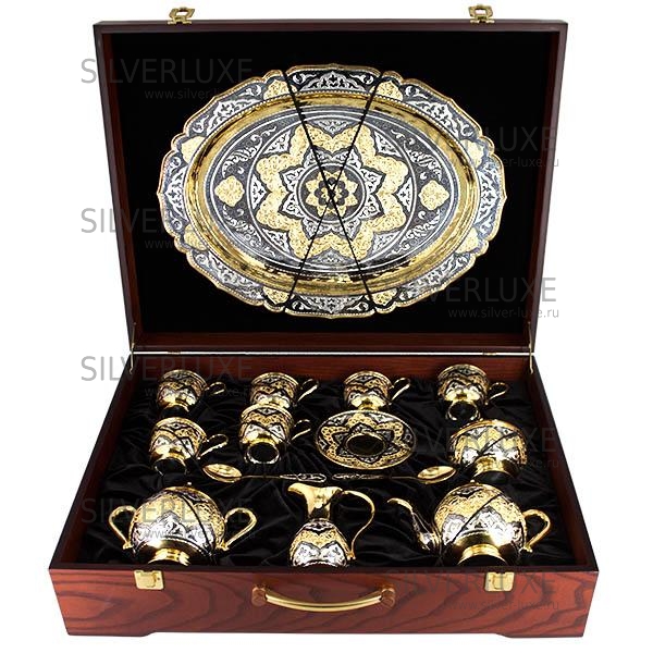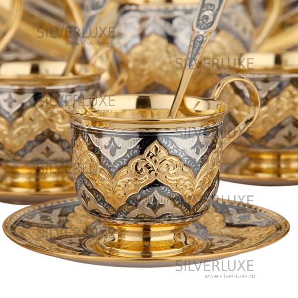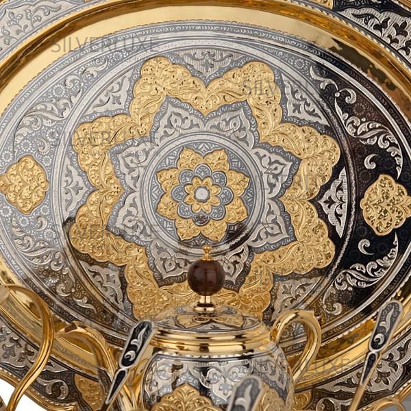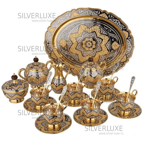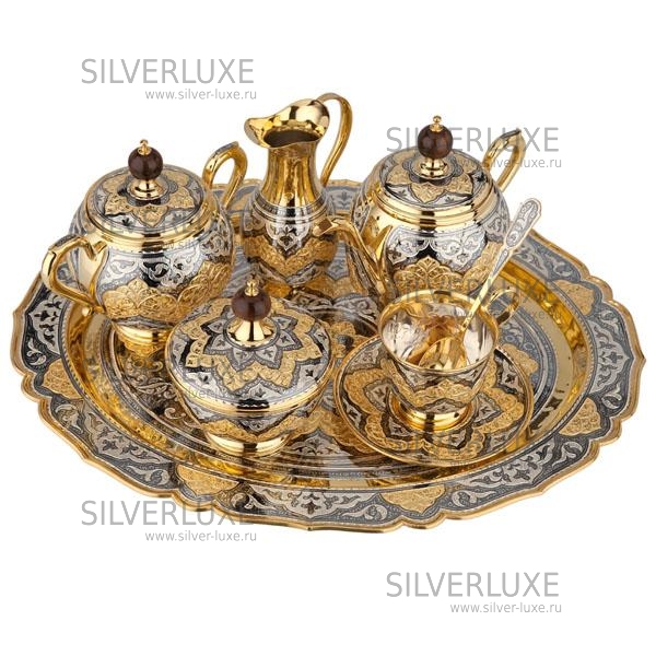 Серебро 875 пробы, с позолотой 999 пробы. В сервиз входят : поднос ,чайник, сахарница, конфетница, молочник, чашки с блюдцем 6 пар, чайные ложки 6 штук. В премиумном исполнении от кубачинских мастеров! Гарантия высшего качества от фирменного магазина!