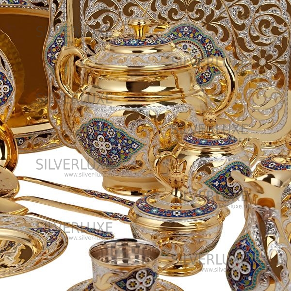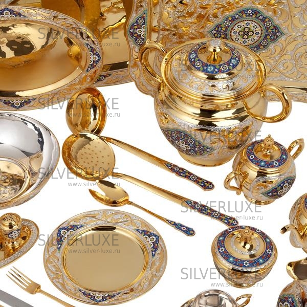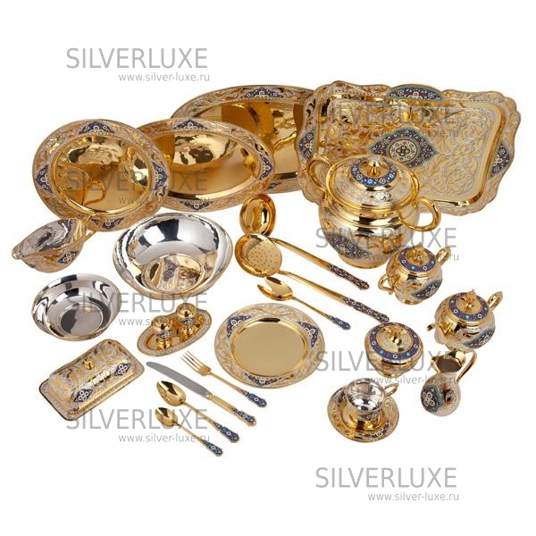 Роскошный сервиз из серебра 875 пробы, покрыт позолотой 999 пробы. Включает в себя чайный и обеденный, обеденный сервиз состоит из 47 предметов, чайный сервиз состоит из 17 предметов. В набор входят: супница с крышкой объемом 3760 мл, 6 закусочных тарелок, 6 суповых тарелок, 1 салатник, 1 круглое блюдо, 1 среднее овальное блюдо (34 см/24 см), 1 большое овальное блюдо (41 см/27,5 см) , соусник, маслёнка, набор для специй (высота солонки 6 см/диаметр 4 см; подставка 15,5/9 см) , половник, шумовка, вилка для салата, столовые приборы (6 чайных ложек, 6 столовых ложек, 6 столовых вилок, 6 ножей; длина чайной ложки 14 см, столовой ложки 18 см, вилки 18,5 см, ножа 24 см), поднос, 6 пар чашек с блюдцем, сахарница, чайник, молочник, конфетница. Столовый набор из серебра - выбор избранных ! Гарантия высшего качества от фирменного магазина!