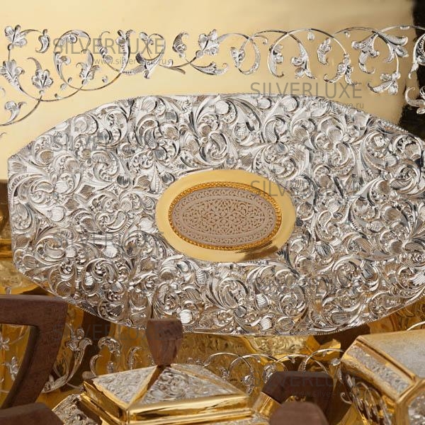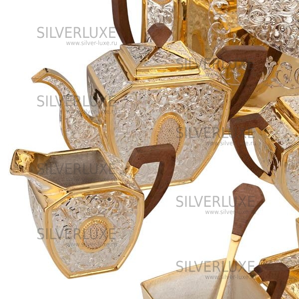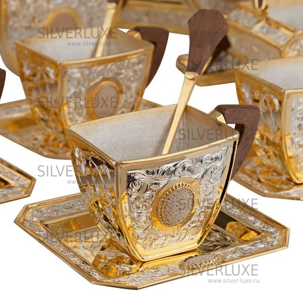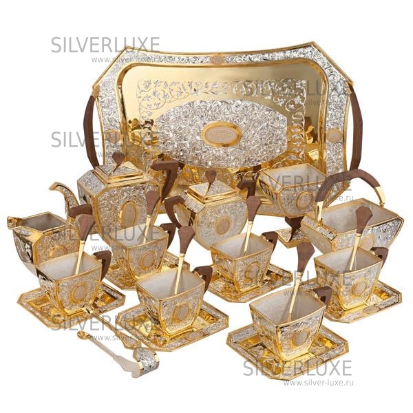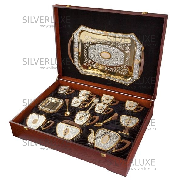 Серебро 875. Покрыт позолотой 999 пробы. Вставки- кость моржа, дерево кавказский дуб. В сервиз входят: чайник, сахарница, поднос, вареньица, конфетница, молочник, 6 пар чашек с блюдцем (длина блюдца внешней стороны 12,5 см, внутренней стороны 6,8 см), чайные ложки 6 штук, щипцы. Роскошный сервиз станет прекрасным украшением любого стола и интерьера! Авторская работа кубачинских мастеров! Гарантия высшего качества от фирменного магазина! Набор в роскошном деревянном футляре!