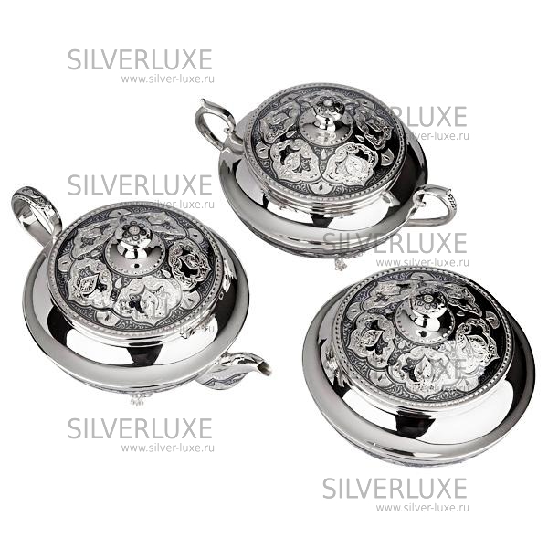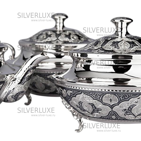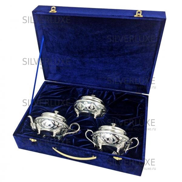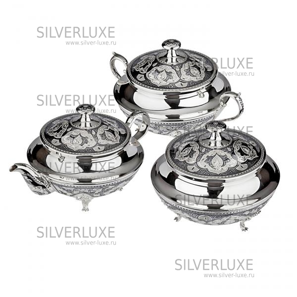Серебро 875 пробы. В набор входят: чайник, сахарница и конфетница на ножках. Объем каждого изделия 500 мл.