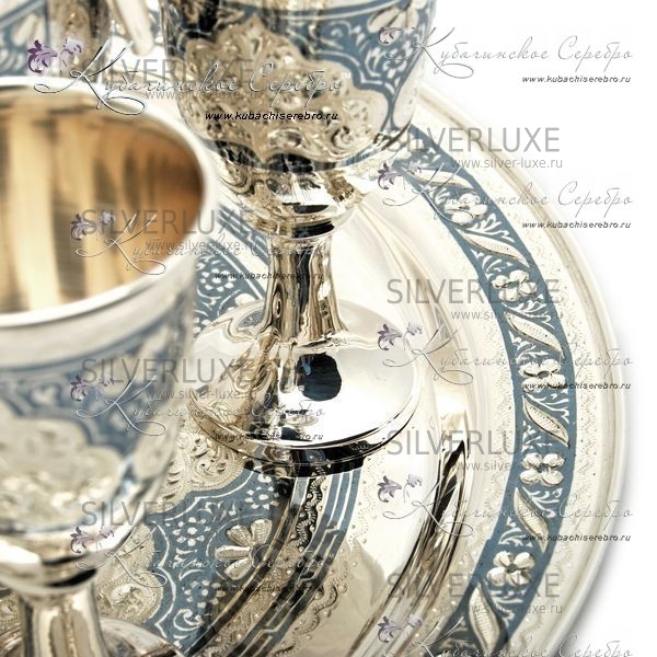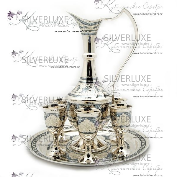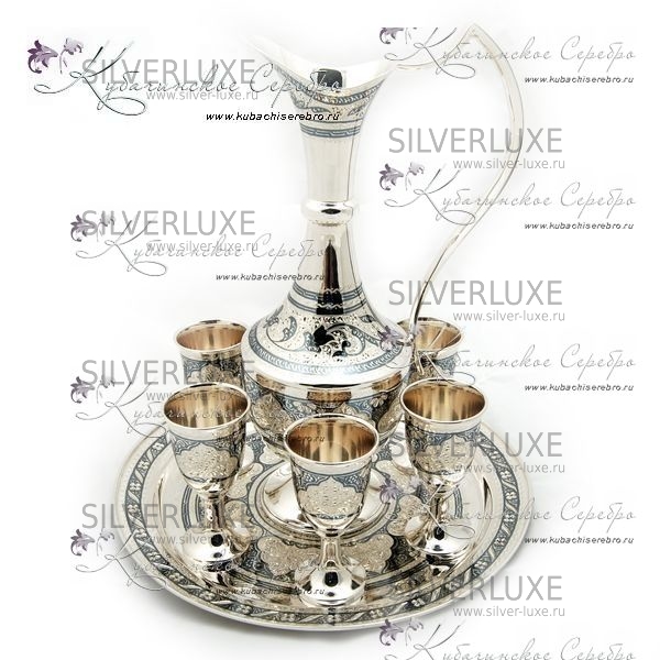 Серебро 875 пробы.В сервиз вхоят: кувшин, поднос и 6 рюмок. В эксклюзивном исполнении от Кубачинских ювелиров! Гарантия высшего качества от фирменного магазина!