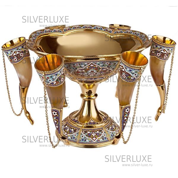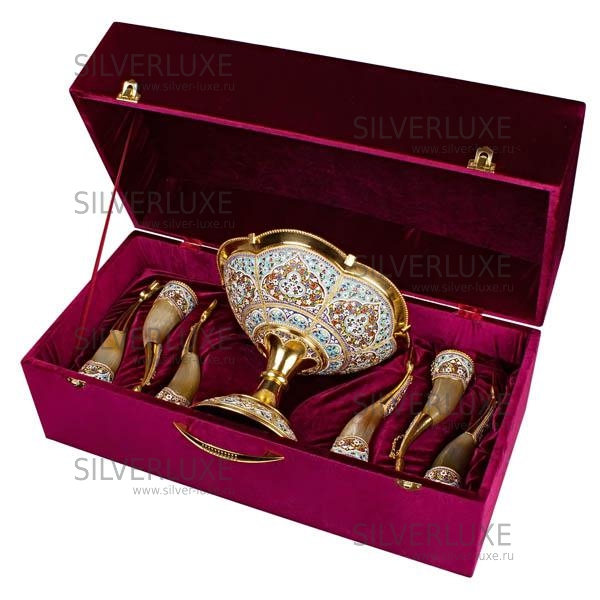 Серебро 875 пробы, покрыт золотом 999 пробы. Великолепный винный набор от Кубачинских ювелиров, добавит роскоши в любой дом. Если дарить - то самое лучшее!