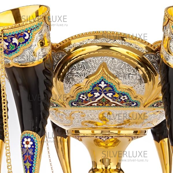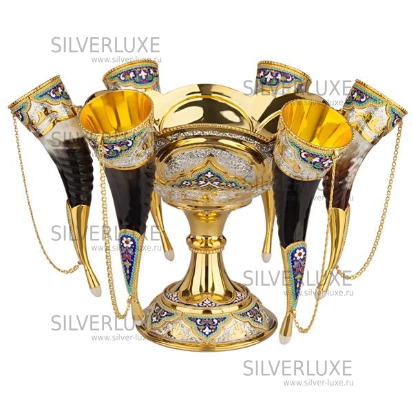 Серебро 875 пробы, покрыт золотом 999 пробы. Великолепный винный набор от Кубачинских ювелиров, добавит роскоши в любой дом. Если дарить - то самое лучшее!