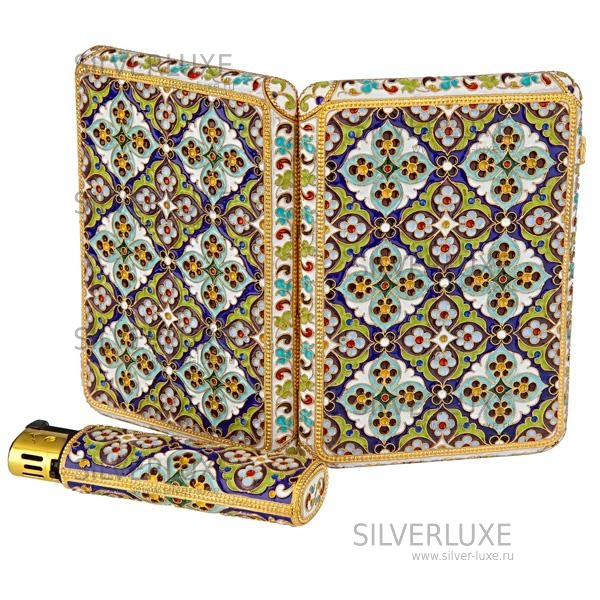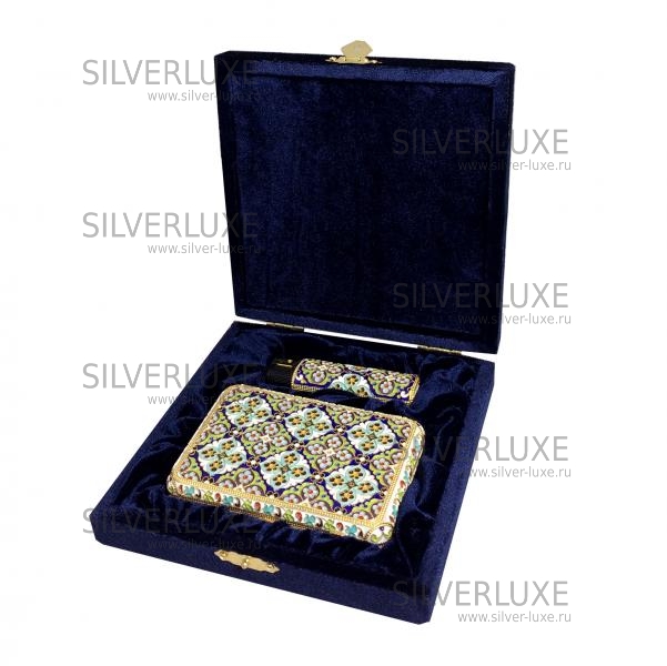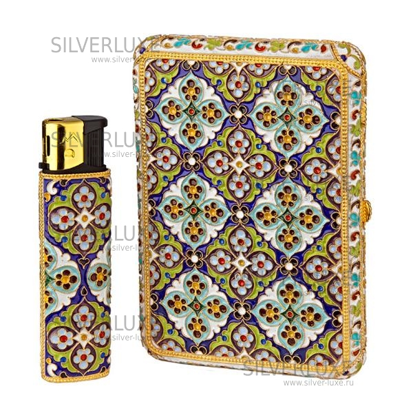 Серебро 875 пробы. Покрыт золотом 999 пробы. В набор входят: футляр под зажигалку и портсигар. Вставки - горячая эмаль! Гарантия высшего качества от фирменного магазина!