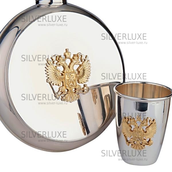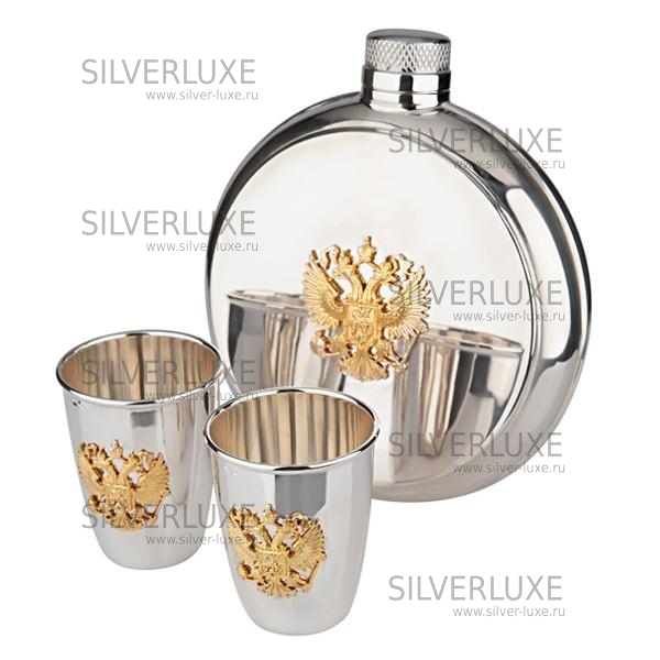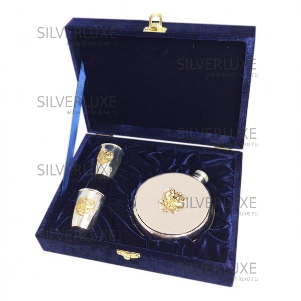 Серебро 875 пробы. В набор входят фляга и две стопки.