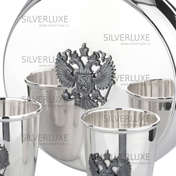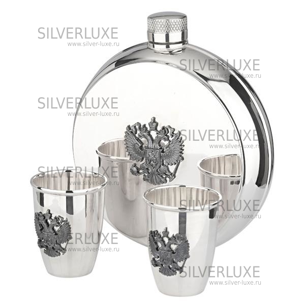 Серебро 875 пробы. В набор входят фляга и две стопки.