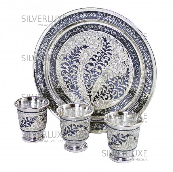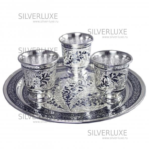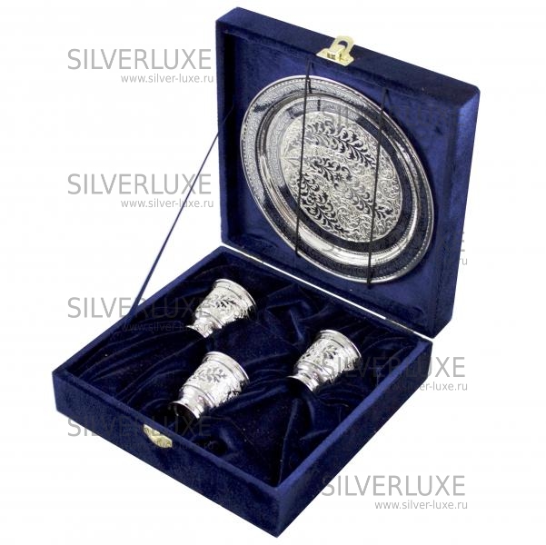 Серебро 875 пробы. В набор входят: поднос и 3 стопки.